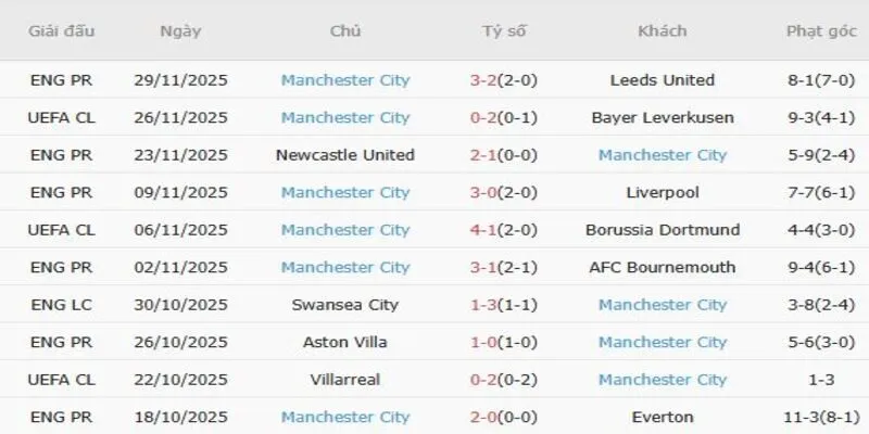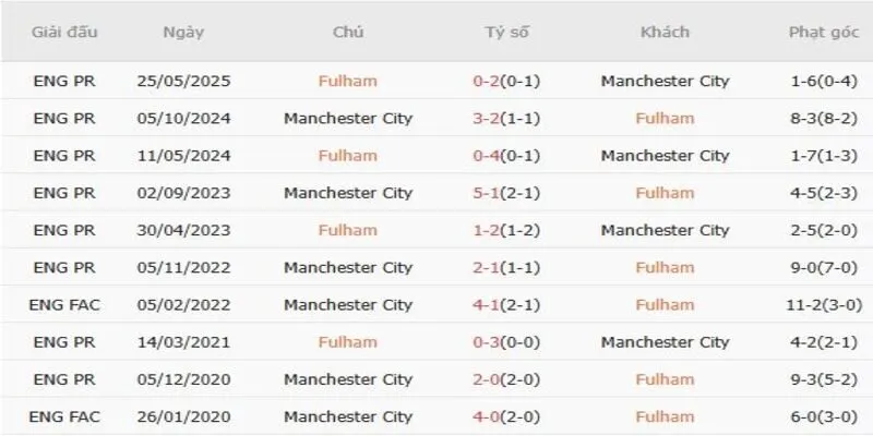 Thành tích đối đầu quá khứ giữa Fulham vs Manchester City