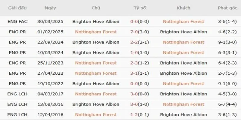 Thành tích đối đầu quá khứ giữa Nottingham Forest vs Brighton