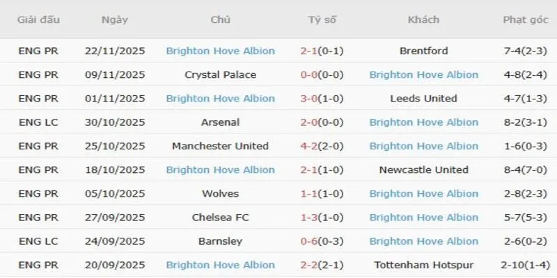 Thành tích ra quân gần nhất của Brighton